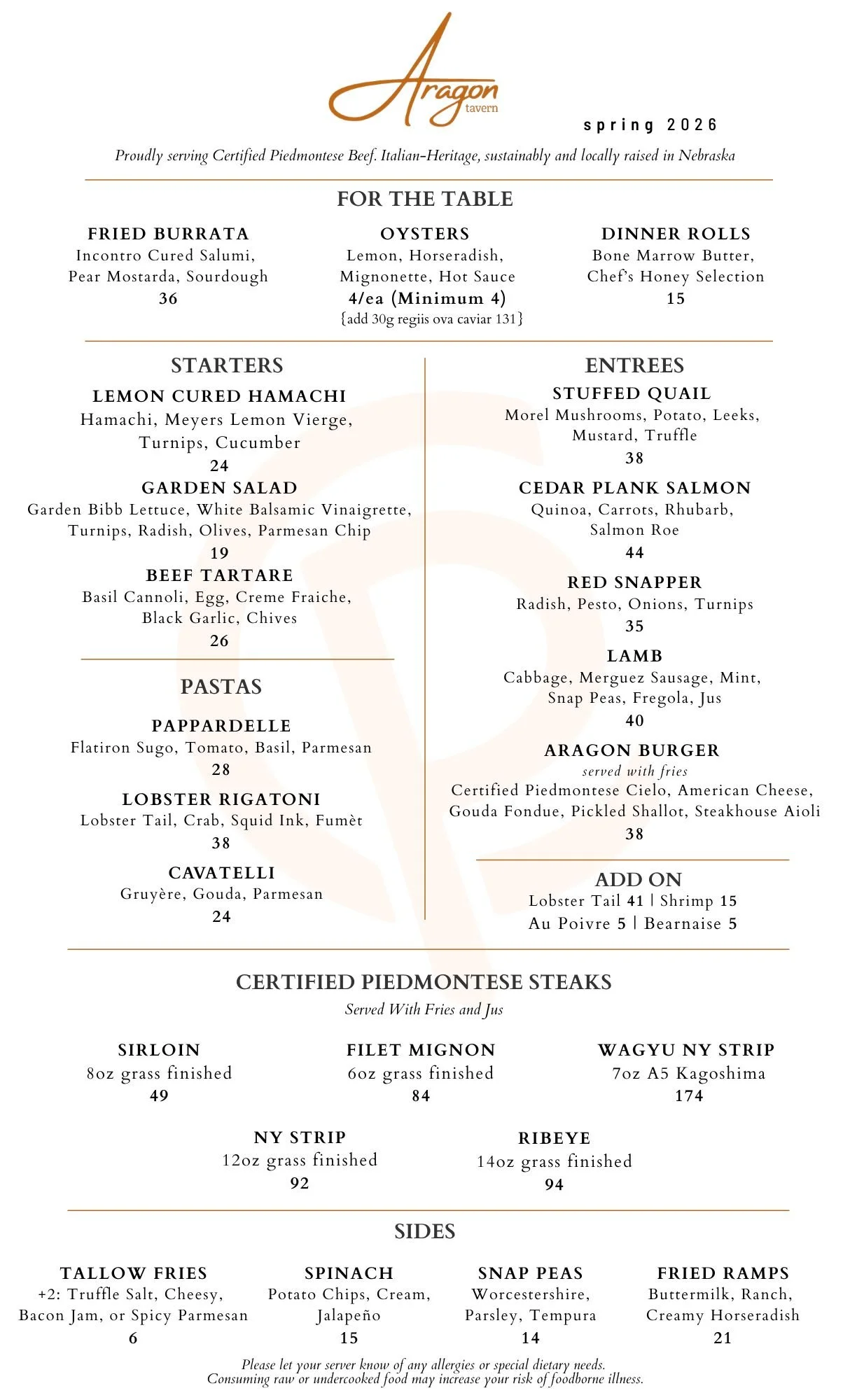 Aragon offers a refined yet approachable dining experience in downtown Lincoln. Featuring Certified Piedmontese beef, seasonal Midwest cuisine, and a strong classic-meets-modern cocktail program all served within a stylish, intimately lit space built for comfort and connection.